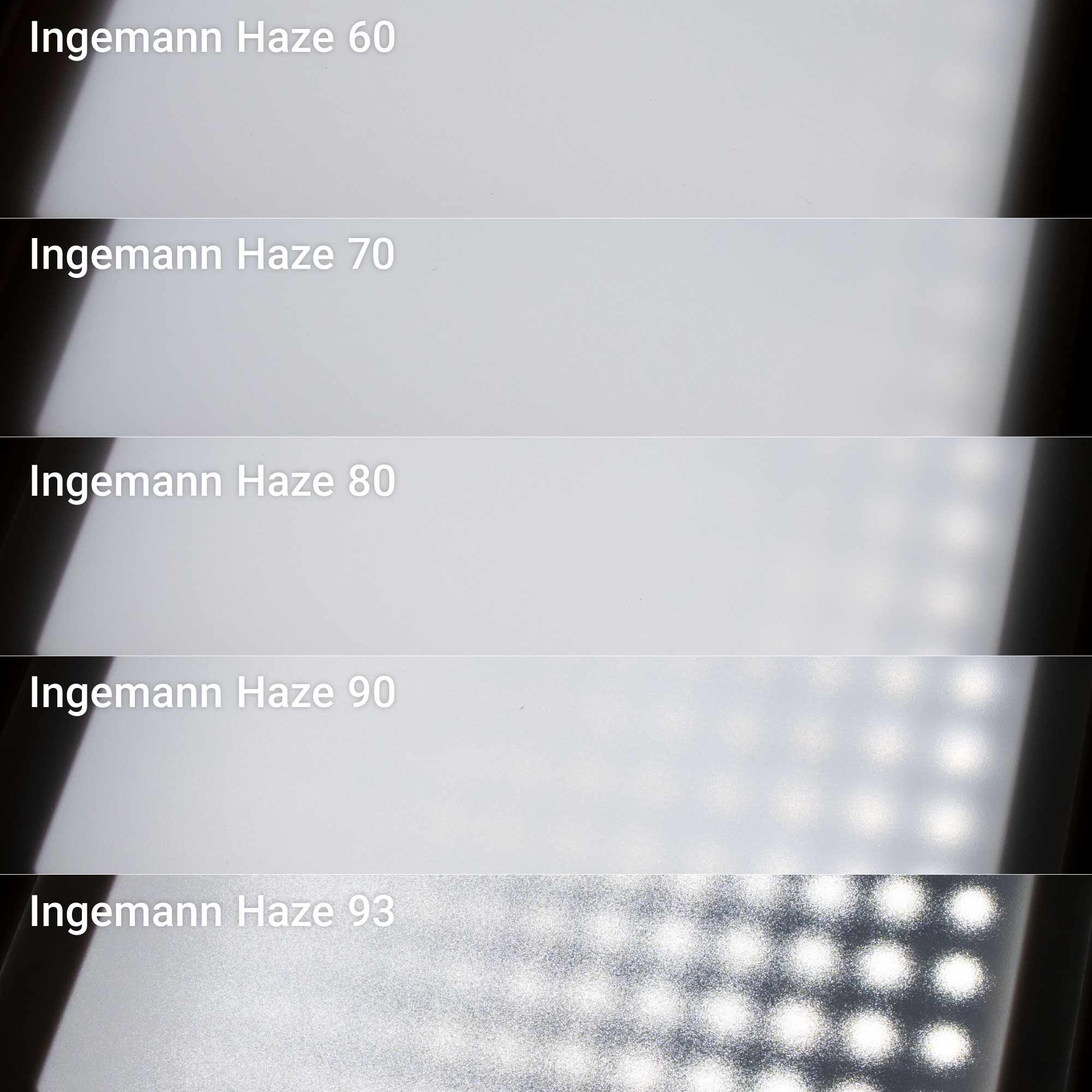 Ingemann Haze series is a range of polystyrene LED diffuser sheets designed for efficient lamp hiding and high light transmission. The diffusion effect is achieved through fine surface structures and specialized additives. The sheets are UV-stabilized, humidity-resistant, and feature an antistatic coating. A cost-efficient solution with a lower CO₂ footprint than PMMA, ideal for sustainable lighting applications.
